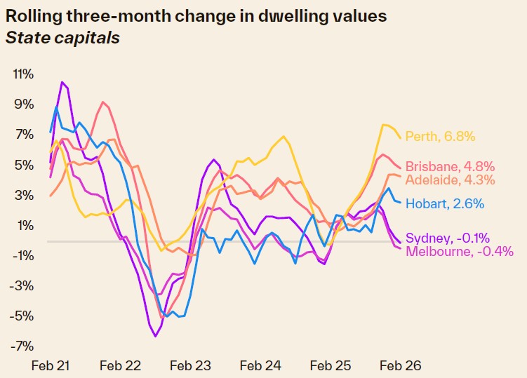 Melbourne and Sydney were flat for the month of February, and have now tipped over into negative price growth over the last quarter. Perth, Brisbane and Adelaide are going the other way, with rising monthly gains and annual price growth now ranging from 11% to 22%.